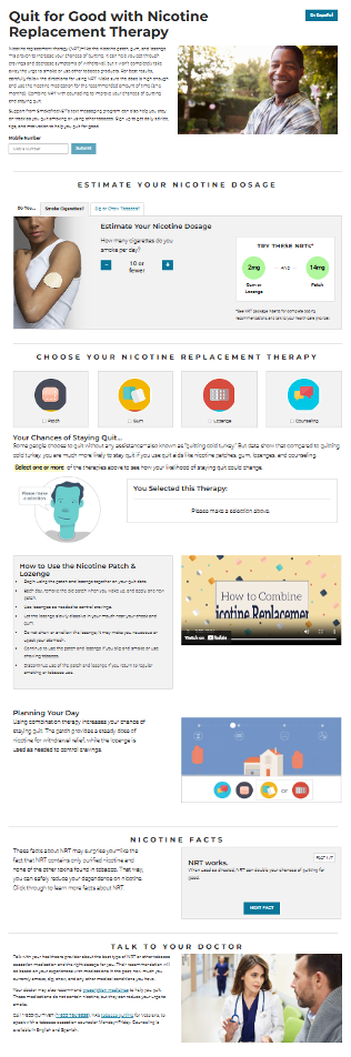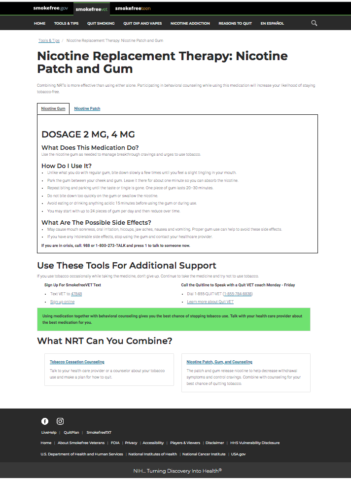 After: We shortened the scroll and moved priority content to the top of the page. Headings and content were revised and restructured for keyword optimization to better fit the desired user flow. We retained visual elements through the use of color and components to replace the images. The NRT dosage graphics were redesigned to avoid clicks.