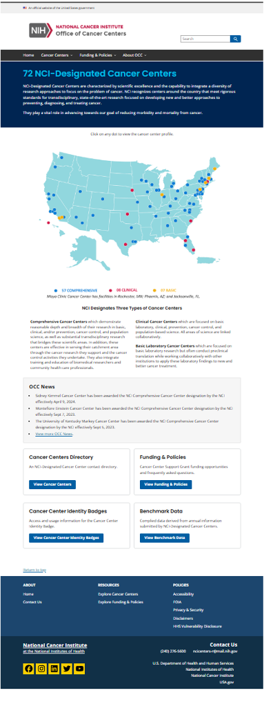 Challenge: Our team was tasked with improving the user experience and migrating the Office of Cancer Centers website to a new platform with a limited budget and strict deadline. The website needed to be improved to allow users to more easily access relevant information and to fit within the design system of the new platform.